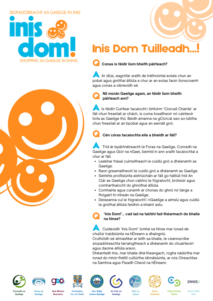Sheol Comhairle Contae an Chláir agus An Clár as Gaeilge an feachtas pobail Inis Dom inniu (Dé Sathairn, an 27 Meán Fómhair), a bhfuil sé mar aidhm aige úsáid agus infheictheacht na Gaeilge a mhéadú i siopaí agus gnólachtaí seirbhíse bhaile Inse.