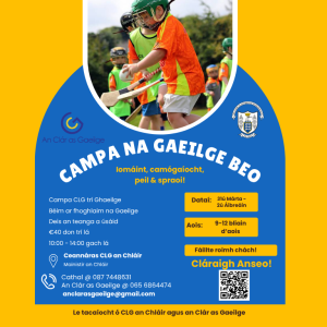 Is campa CLG trí Ghaeilge é seo ina mbeidh deis ag rannpháirtithe páirt a ghlacadh i ngníomhaíochtaí éagsúla ar nós iomáint, camógaíocht agus peil, agus iad ag úsáid na Gaeilge i dtimpeallacht nádúrtha agus chairdiúil. Cuirtear béim ar fhoghlaim trí spraoi, rud a chabhraíonn le páistí muinín sa teanga a fhorbairt agus í a úsáid go laethúil gan bhrú.